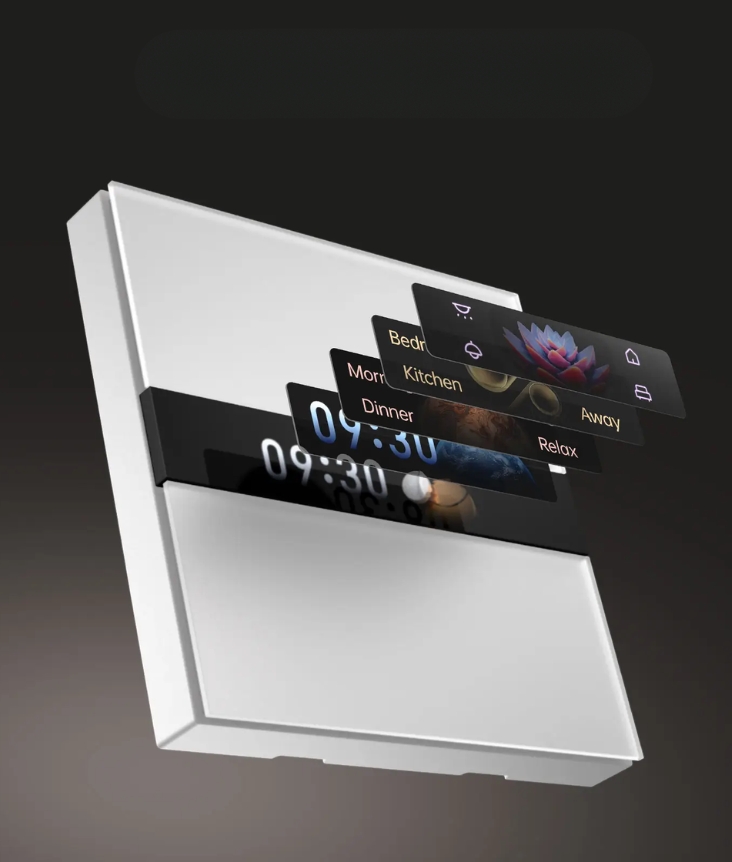 Умный настенный выключатель V1 EU — это 4-клавишный, двухканальный выключатель с нейтральным проводом, оснащенный 2-мя физическими, 2-мя логическими кнопками и 2,08-дюймовым LCD-экраном. Он поддерживает настройку текстов, соответствующих определенным устройствам, что помогает легко понять, какое устройство контролирует каждая кнопка.