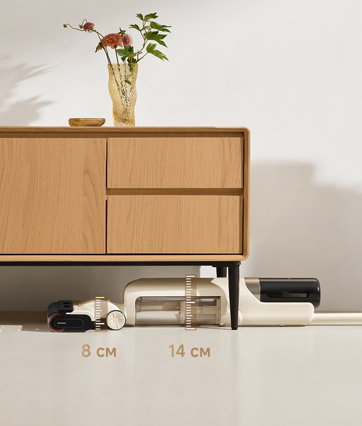 Благодаря уникальной конструкции моющий пылесос Trouver K30 легко проникает под мебель высотой от 14 см. Это позволяет убирать по всему дому без необходимости передвигать тяжёлую мебель, делая уборку проще и комфортнее.