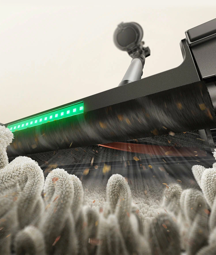 Универсальная насадка беспроводного вертикального пылесоса Trouver G70 Detect оснащена подсветкой, которая помогает легко обнаруживать пыль и мусор даже в тёмных углах, делая уборку более тщательной и комфортной.