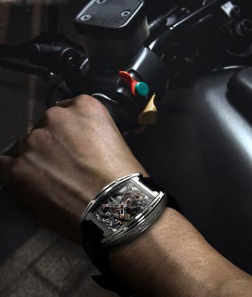 Двусторонняя полая конструкция часов предоставляет возможность разглядеть каждый элемент циферблата, позволяя проникнуть в самое сердце слаженного механизма.