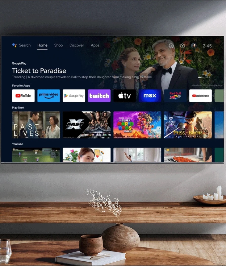 ыбирайте любимые фильмы и сериалы из более чем 400 000 наименований или скачивайте из более чем 7 000 приложений и игр, доступных в магазине Google Play*. Телевизор также поддерживает онлайн-видео с популярных стриминговых платформ, таких как Netflix, Prime Video и YouTube. Ваш телевизор стал еще полезнее. Попросите Google Ассистента найти фильм, открыть приложение, включить музыку или управлять телевизором — всё это можно сделать голосом. Вы также можете получать ответы и управлять устройствами умного дома. Просто нажмите кнопку Google Ассистента на пульте, чтобы начать. Доступ к растущей библиотеке живых каналов с новостями, фильмами, развлечениями, реалити-шоу и другим*. Смотрите бесплатно в любое время и в любом месте. Подписка не требуется.