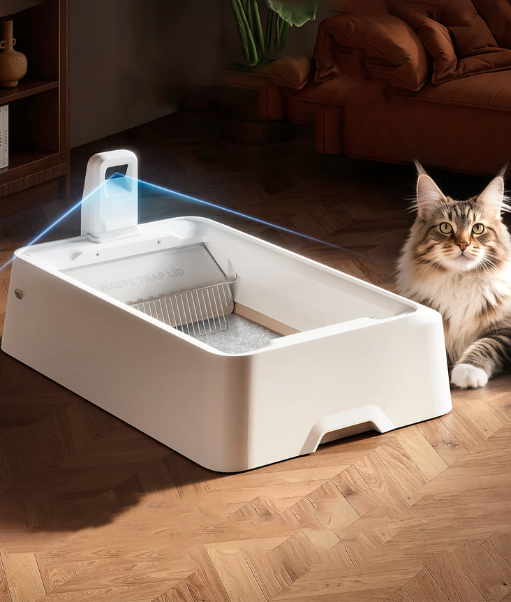Designed for comfort with a spacious open-top and whisper-quiet operation, it welcomes cats of all sizes, from playful kittens to majestic Maine Coons.