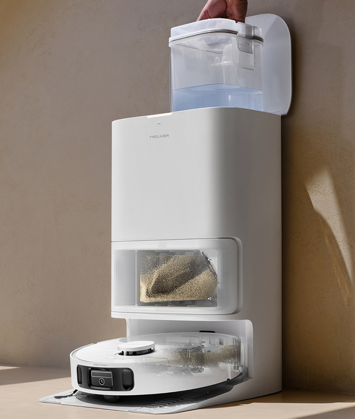 Базовая станция робота-пылесоса Trouver E40 Ultra стирает тряпки, тщательно выполаскивает их и высушивает тёплым воздухом, чтобы вы могли забыть о ручной чистке после каждой уборки. Вам остаётся лишь периодически менять воду в баках и раз в 75 дней заменять пылесборник.