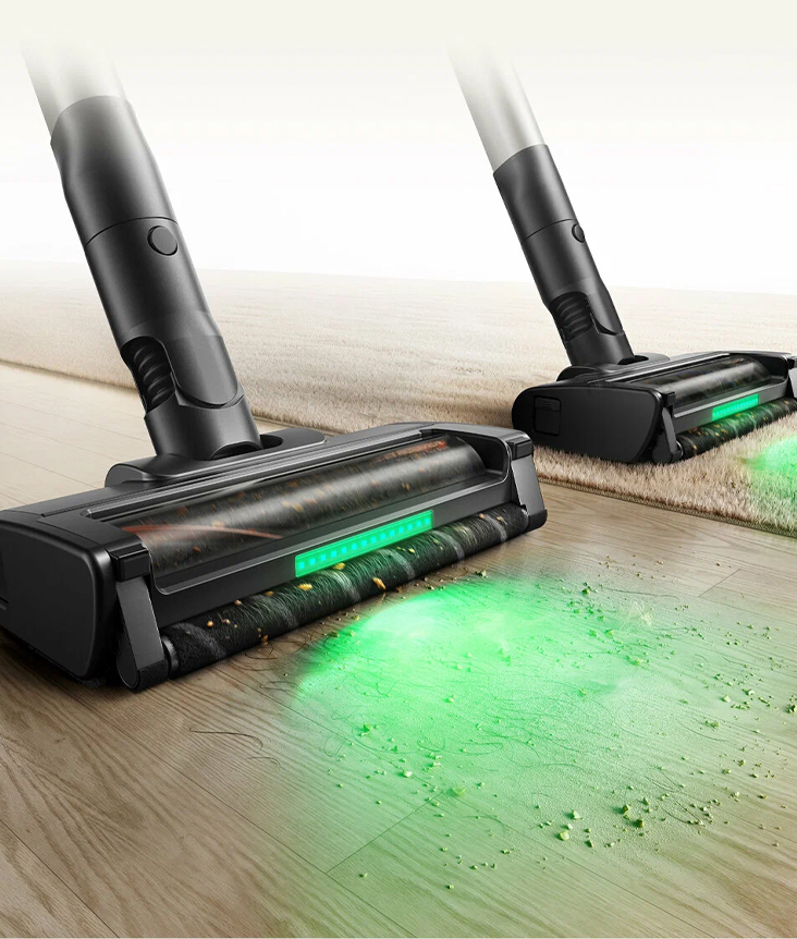 Универсальная насадка беспроводного вертикального пылесоса Trouver G70 Detect оснащена подсветкой, которая помогает легко обнаруживать пыль и мусор даже в тёмных углах, делая уборку более тщательной и комфортной.