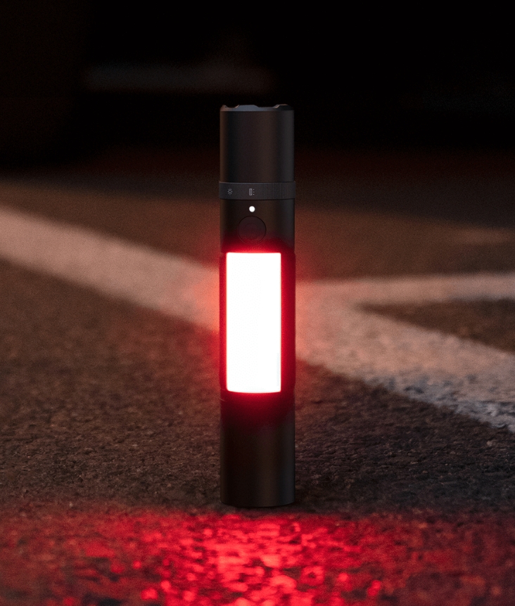 Чтобы быстро реагировать на аварийные ситуации, включите главный фонарь. Боковой фонарь производит мигающий красный/противотуманный свет, который проникает сквозь туман и подает аварийный сигнал. Поворачивая кольцо, можно легко переключаться с режима основного фонаря на режим бокового фонаря. Регулируйте положение кольца с помощью одной кнопки, чтобы использовать фонарь в самых разных ситуациях.